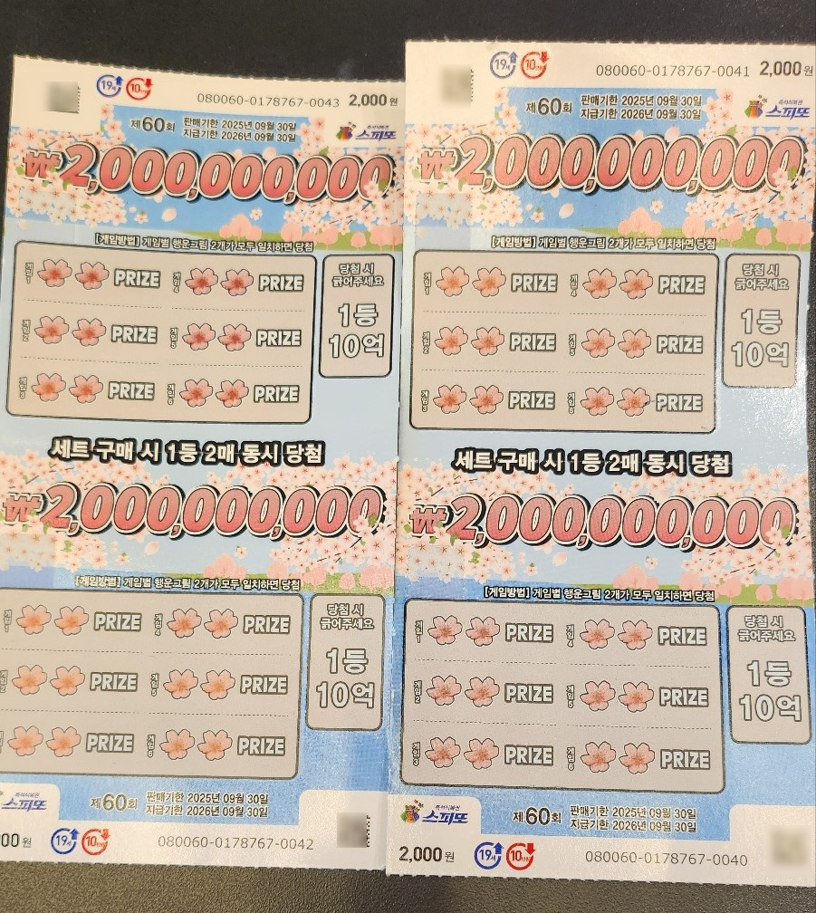 당첨률 35.3%, 환급률 60% 한 세트(4000원)를 위 아래가 맞게 구입하면